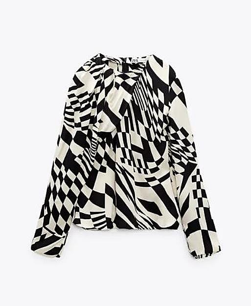 Hablamos de una blusa de manga larga y cuello redondo protagonizada por un estampado geométrico en color blanco y negro. Ya sabes, la tendencia setentera ha llegado para quedarse y no solo se ha visto reflejada en los vestidos, las botas altas o los pantalones de pana o acampanados. Sino también en prendas como esta blusa de Zara que tiene una clara influencia de esta década. Y como no podía ser de otra forma, ha gustado tanto que ya tiene algunas tallas agotadas y ya es una de las favoritas de las influencers.