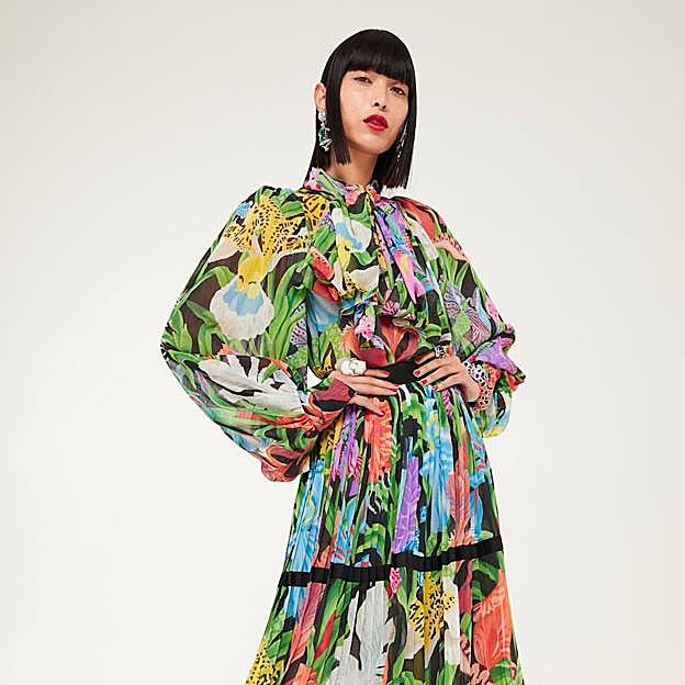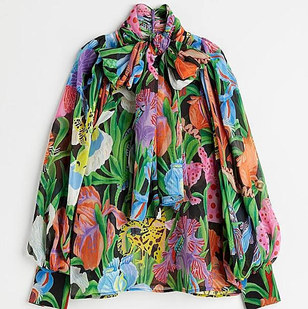 Se trata de una blusa confeccionada en tejido ligero y vaporoso con estampado floral multicolor en tonos vibrantes. Es un diseño con cuello elevado que tiene detalle de lazada sobredimensionado. Las mangas largas tipo globo son muy amplias, con detalles fruncidos para dar más volumen y puños ceñidos. Y, el corte es holgado y fluido.