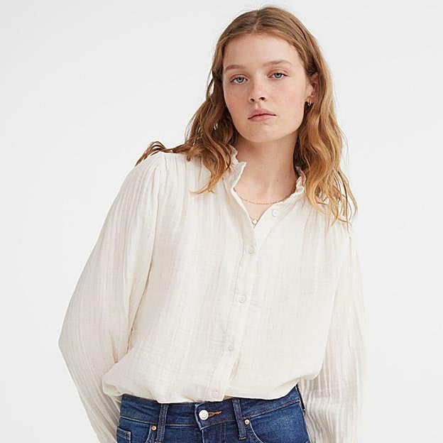 Y la tercera y ultima opción es esta de muselina de algodón, en color crudo y con canesú en la espalda. Algo más informal porque se puede llevar o bien metida por dentro de los pantalones o a modo de camisola, por fuera. Cuesta 27,99 euros y también está disponible en todas las tallas.