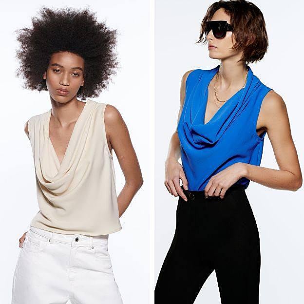 Como manera de elevar los básicos, podemos incluir estos escotes en tops muy funcionales que queden bien con cualquier pantalón o falda, sobre todo si tienen talle alto para un efecto que estilice la figura. Por ejemplo, este cuerpo en tejido ligero con manga sisa y escote fluido con pliegues, a 19,95 euros. Puedes encontrarlo en colores de la temporada alegres como el turquesa, ideal para resucitar el look. O, en neutros siempre elegantes como el crudo.