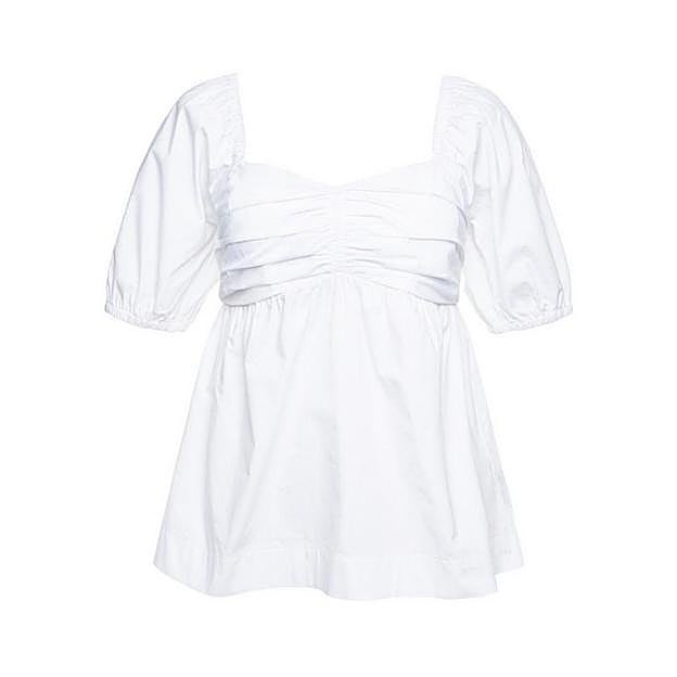 La primera de ellas es un modelo popelín en color blanco y de manga corta que tiene un diseño muy original y que lo disimula todo. Está formado por un cuerpo fruncido que va ajustado en el pecho que también tiene escote en forma de corazón y por una parte inferior holgada y de corte evasé. Cuesta 13 euros.