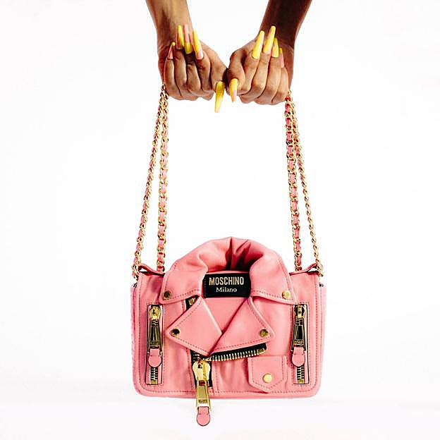 Irónico e irreverente, Jeremy Scott reinventa para Moschino una de sus prendas míticas, la cazadora motera de cuero para convertirla nada más y nada menos que en un bolso de mano. Confeccionada en cuero e imitando la forma de una chupa de piel doblada, la bandolera es pura diversión. Realizada en napa de colores que van del clásico negro al rojo, el amarillo o el azul cielo, las cremalleras doradas y el asa de cadenas son el toque definitivo.