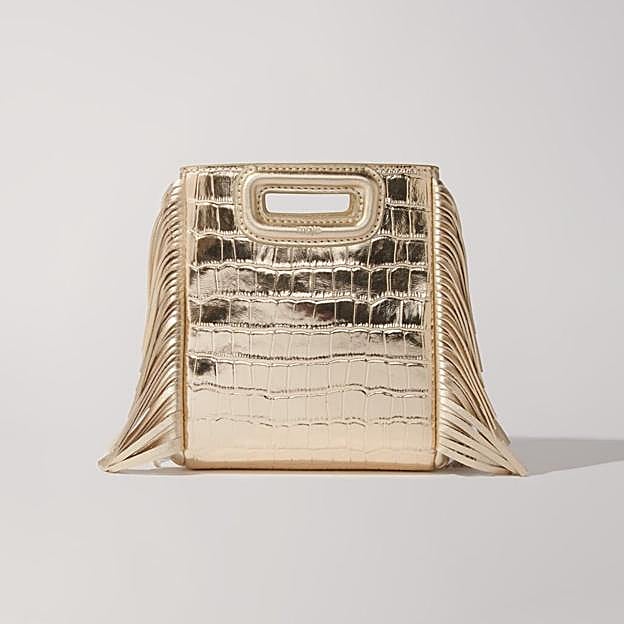 Bolso M Mini de piel de cocodrilo de Maje. Decorado con flecos en los lados y equipado con un asa enfundada, un logotipo dorado en relieve, así como la insignia grabada en los mosquetones. Es un bolso práctico gracias a su cierre magnético, está equipado con una bandolera ajustable y es desmontable para llevarlo de diferentes formas (en la mano, al hombro o cruzado). Precio: 275 euros.
