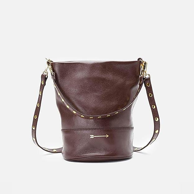 Perseo Testa de Mercules. Bolso mediano de piel estilo cubo que cuenta con dos asas de remaches desmontables: corta para poder llevarlo en el hombro o en la mano y una larga para llevarlo estilo bandolera o colgado. Además de tener mucha capacidad en su interior, tiene un bolsillo con cremallera y se cierra con un imán. Precio: 245 euros.