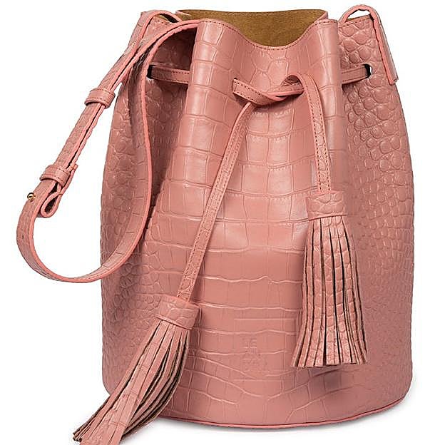 Bucket bag de Leandra Bags. Funcional y elegante, el complemento imprescindible en tu armario, es un bolso tipo saco que lo tiene todo para que tu look sea simplemente perfecto. Su borla bicolor aportará movimiento y estilo a tu outfit. Es un bolso tipo saco de piel grabado en coco 100% made in Spain. Precio: 290 euros.