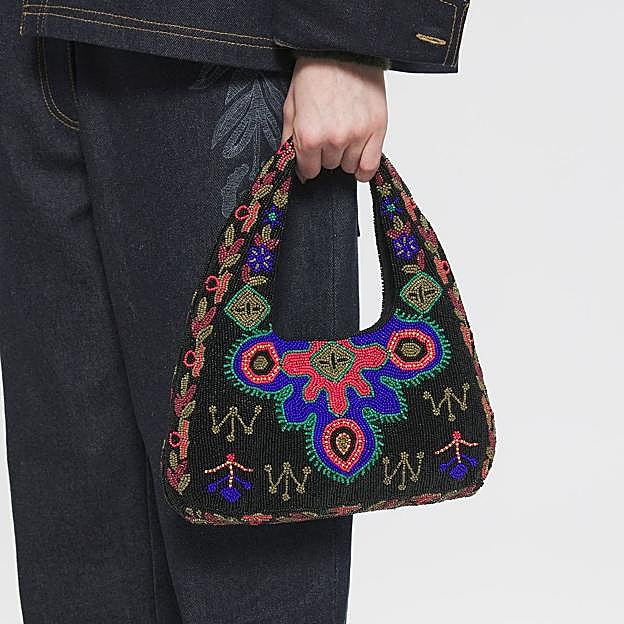 Tesora de Antik Batik. Bolso de algodón bordado a mano con abalorios. Tiene el asa pequeña, cierre con cremallera y un pequeño compartimento interior con cremallera. Precio: 270 euros.