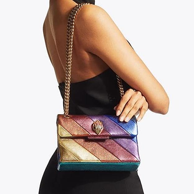 El bolso Mini Kensington está confeccionado con una edición puesta de sol de piel de vaca flor granulada laminada metalizada con el icónico patrón de rayas diagonales cosidas con arcoíris. La cabeza de águila dorada presenta cristales de arcoíris y ojos de cuentas negras en la solapa frontal. Precio: 230 euros.