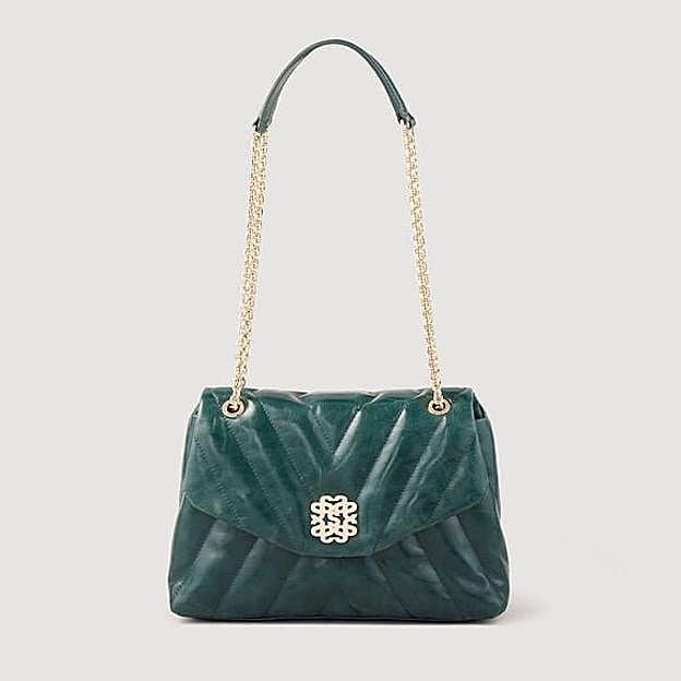 Bolso de piel texturizada acolchada con solapa, sublimado con un cierre con firma gráfico y una bandolera de cadena con refuerzos de piel que ofrece diferentes formas de llevarlo: doble al hombro o cruzado. Precio: 316 euros.