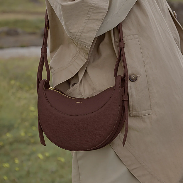 El Numéro Dix de Polène, elaborado por artesanos del cuero en Ubrique, España, que destaca por su diseño en forma de media luna juega con la yuxtaposición de curvas. Precio: 380 euros.
