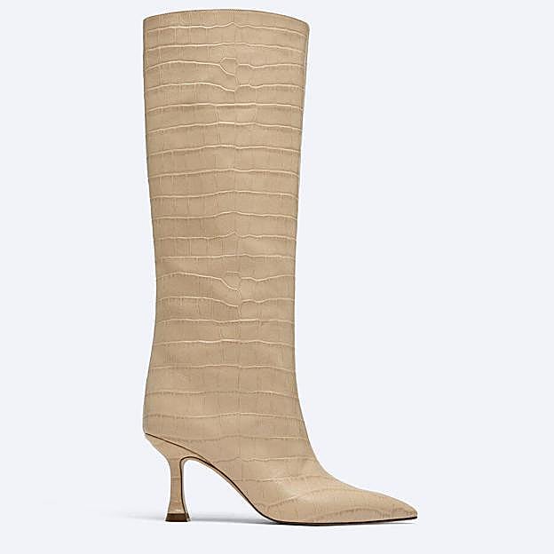 Afortunadamente, Uterqüe es el héroe de nuestro zapatero esta temporada con no 1 sino 2 copias de este tipo de botas. La primera, es de caña alta, con un tacón fino, pero más bajo que el de Paris Texas o Bettina Vermillion, lo que las hace más cómodas y fáciles de llevar. Acabada en punta, con corte en piel de coco, en un beige claro y 'made in Spain'. Serán tuyas por 179 euros.