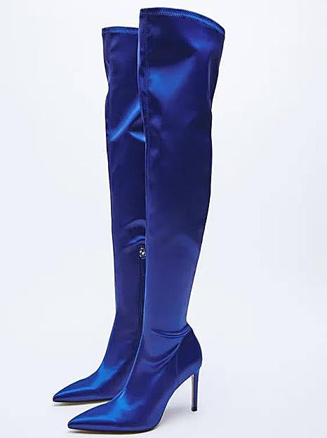 Quizás no es casualidad que Zara se haya decidido a replicar casi al dedillo, estas botas de satén, cuya única diferencia está en el remate de la parte de arriba, que son más ajustadas (para hacer efecto de que alargan la pierna) y en su precio, muchísimo más bajo que el de la firma de lujo, ya que solo cuestan 69,95 euros (y también vienen en negro, para las que no se atrevan con el color de moda).