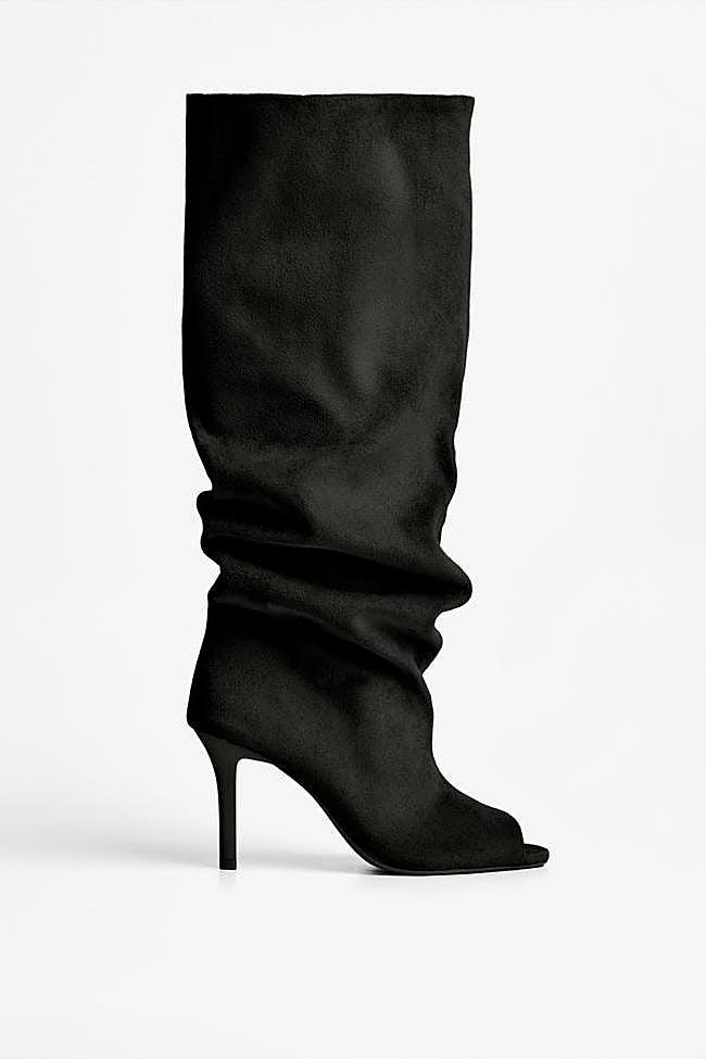 Bota alta de Bershka de tacón fino y muy alto y caña arrugada ancha. Confeccionada en ante, destaca por la abertura delantera. Precio: 59,99 euros.
