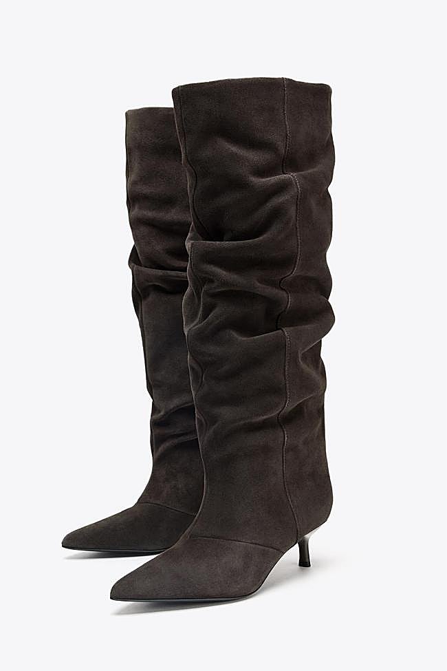Bota de Zara confeccionada en serraje con detalles fruncidos en caña, tacón kitten y cierre fácil mediante pull on. Precio: 89,95 euros.