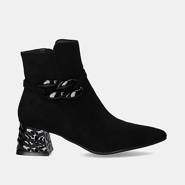 botines Exé de material textil y tacón con textura es un símbolo de elegancia atemporal. Su diseño en color negro cuenta con un adorno en forma de dos eslabones. Precio: 84,95 euros.