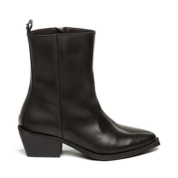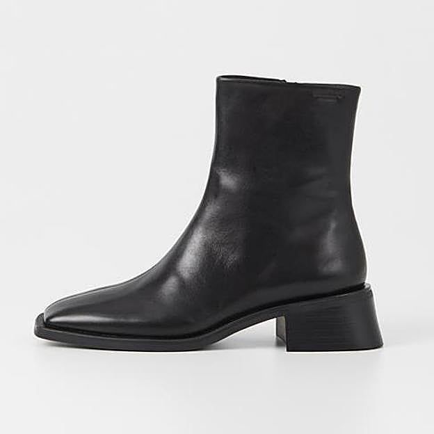 Botines contemporáneos con un diseño minimalista de Vagabond. El modelo está confeccionado en cuero negro con puntera cuadrada, cremallera en la cara interior y costuras decorativas. El tacón acampanado mide 47 mm. Precio: 150 euros.
