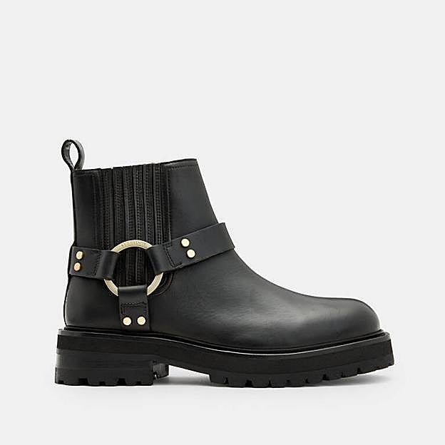 Botín de Allsaints confeccionado con cuero resistente y de alta calidad. Se completa con un llamativo detalle de anilla en D y un arnés en el lateral. Precio: 202,30 euros.