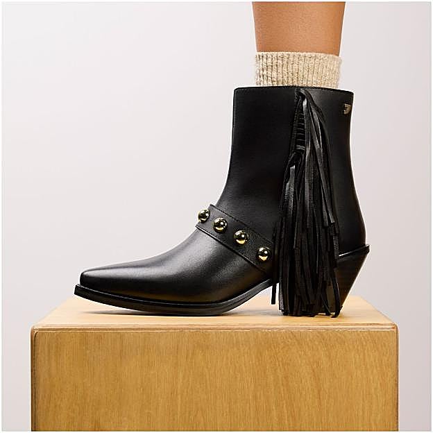 Botines de piel de Gioseppo con tacón y adorno de flecos y tachas. Cuentan con piso de goma flexible y plantilla acolchada para favorecer el confort. La altura tacón es 5 cm. Precio: 124,95 euros.