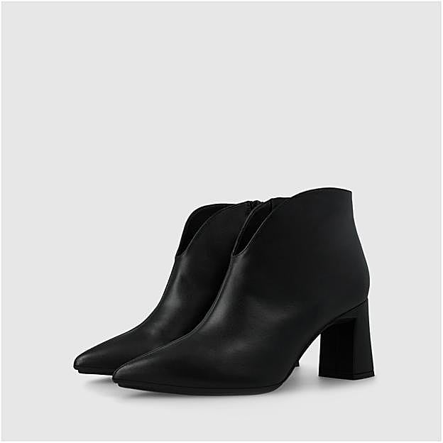 Botines de Lodi de piel. Tiene el detalle de escote de la caña en V y es un diseño confeccionado con tacón ancho de 7.5 cm de altura. Precio: 159 euros.