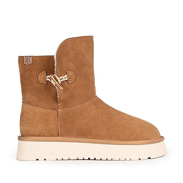 Este modelo de Ría Menorca está fabricado en ante de alta calidad proveniente de ovejas de Nueva Zelanda. El interior está forrado con lana real reciclada, ofreciendo una calidez inigualable. Gracias a la piel de oveja de doble cara, estas botas repelen la lluvia y la nieve ocasionales, mientras que la suela de goma, de 2 cm de grosor, aísla los pies del frío, proporcionando comodidad y protección en cada paso. Precio: 101,95 euros.