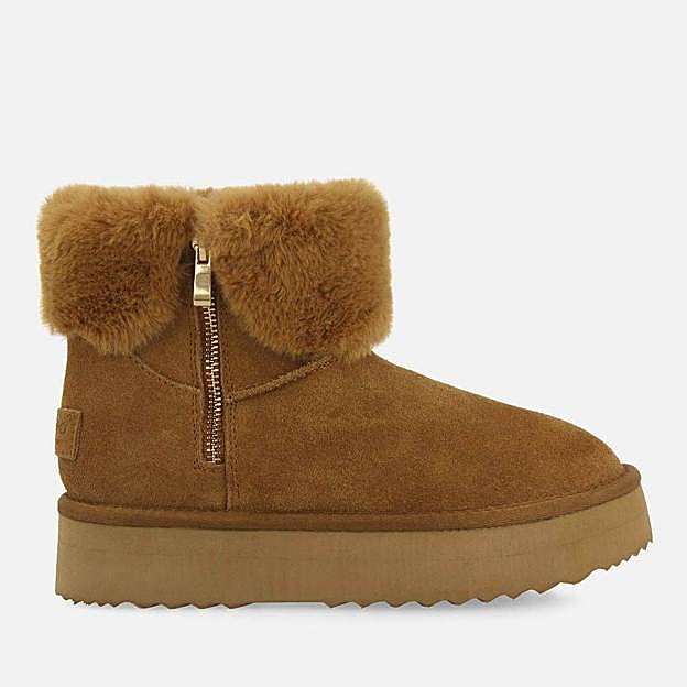 Estos botines color cuero estilo australiano son de Gioseppo y están confeccionados en piel. Tienen un diseño con cremallera en el lateral y forro interior de pelo y cuentan con piso ligero de EVA y plantilla y forro de poliéster. Precio: 54,95 euros.