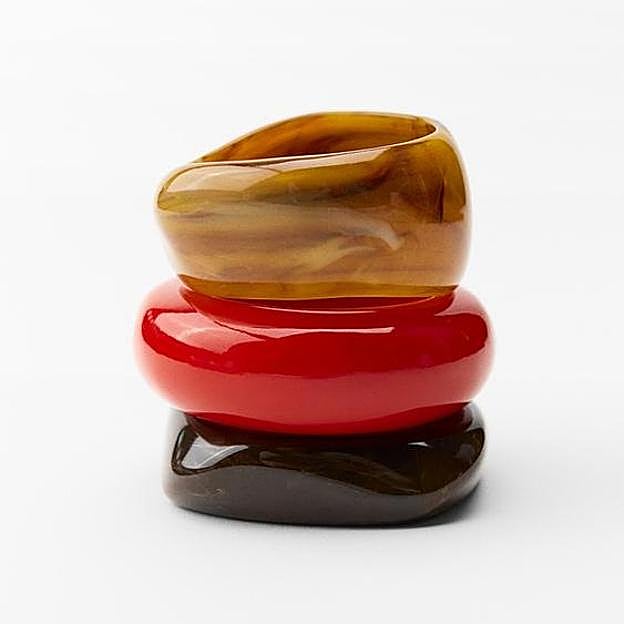 Zara. Pack de tres pulseras realizadas en resina de diferentes formas (15,95 euros).