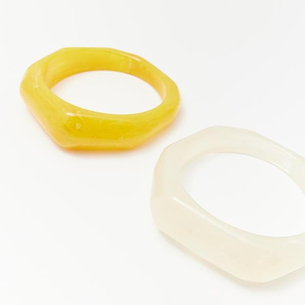 Sfera. Set de dos pulseras rígidas de resina en color amarillo y blanco (6,99 euros).
