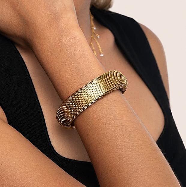 Singularu. Brazalete malla de acero bañado en Oro de 18kt rígido y maxi (25,99 euros).