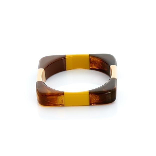 Alexah. Brazalete con forma cuadrada con bordes redondeados en tonos marrones y un toque amarillo (15 euros).
