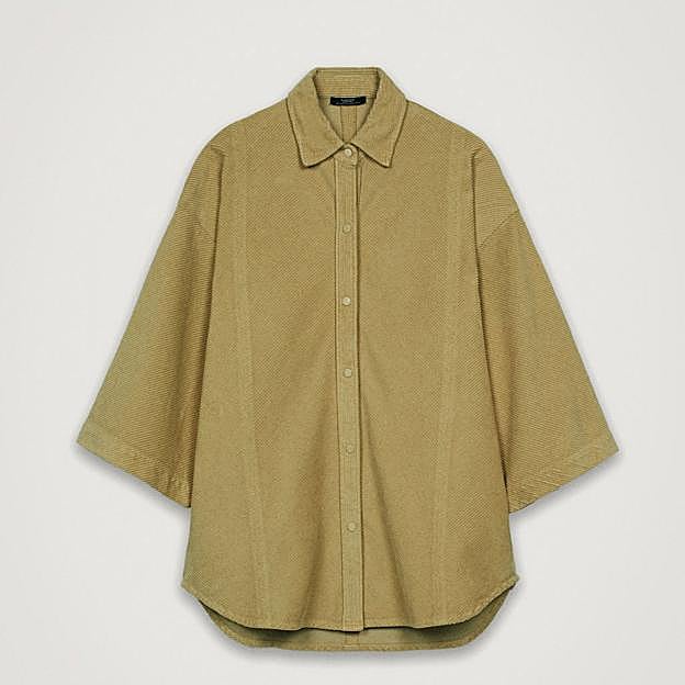 La influencer elige esta camisa de pana 100% algodón en un tono verde claro que casi parece beige. Es amplia con corte oversize y talla única, adaptándose a todo tipo de cuerpos. Este diseño tiene cuello solapa clásico, mangas tres cuartos anchas ligeramente acampanadas, silueta relajada con hombros caídos y cierre de botones a presión.