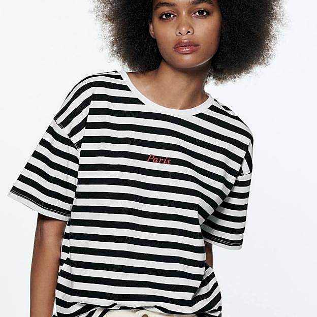 Para terminar, Zara nos presenta esta bonita camiseta básica de manga corta, cuello redondo y fit oversize, con print de rayas blanco y negro que se adorna mediante un texto bordado a contraste color rojo, con la palabra 'París', con un precio de 15,95 euros.