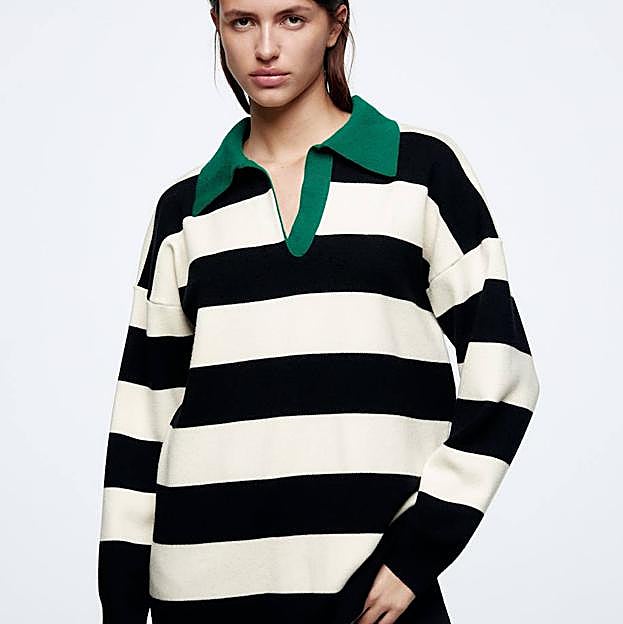 Y, un jersey tipo polo de corte amplio, silueta relajada y manga larga, también a rayas blanco y negro y, con cuello solapa en tono verde, a 39,95 euros y en las tallas S, M y L.