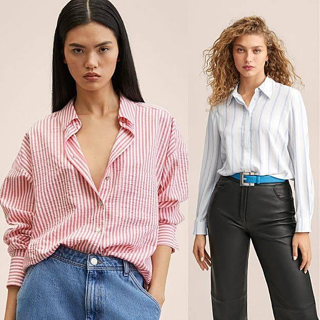 Continuamos con las camisas, esta vez en Mango. Aquí podremos elegir entre una camisa de tejido fluido, cuello solapa, manga larga, recular fit y print a rayas en varios grosores, en tono azul celeste y blanco, por 19,99 euros. O, esta otra camisa oversize, con silueta relajada y tejido con textura, a rayas en rojo y blanco, con un coste de 29,99 euros.