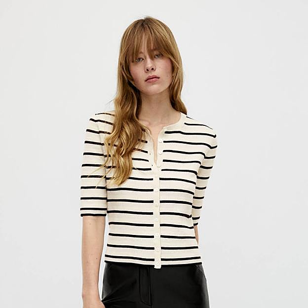 En Massimo Dutti hemos encontrado este elegantísimo cárdigan de estilo parisino. Se trata de una chaqueta de punto canalé fino con silueta ajustada, cierre de botones, tacto suave, manga corta francesa y estampado a rayas finas horizontales, en tonos crudo y negro, por 39,95 euros, disponible entre la talla S y la XL.
