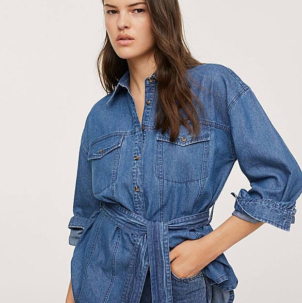 En Mango encontramos el modelo perfecto para llevar junto a unos vaqueros boot cut o efecto piel, ya sea en pantalones o falda de tubo. Una camisa con mangas sutilmente abombadas recogidas en puño, hombros caídos y cinturón a juego, para estilizar la figura, en azul medio más oscuro, por 39,99 euros.