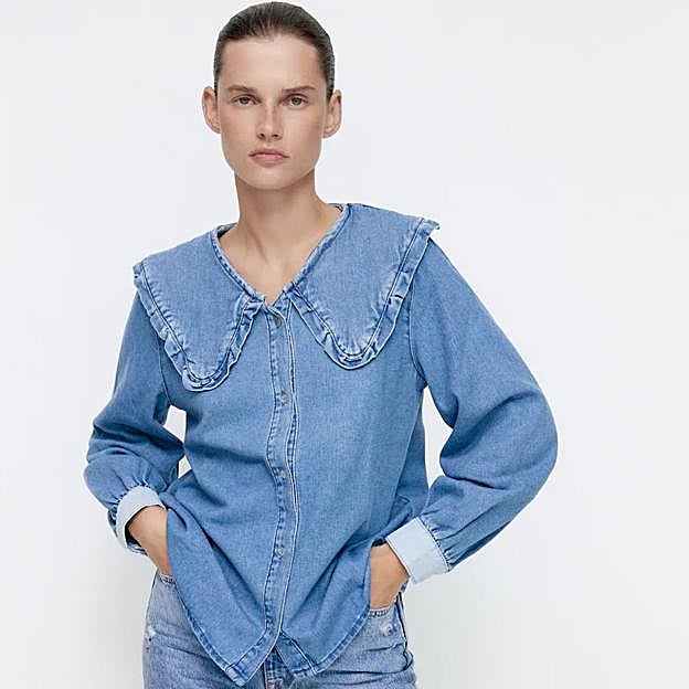 La propuesta de Zara es romántica, femenina y retro, muy años 80. Manga larga ligeramente abombada, puños en contraste, cierre frontal de botones y cuello bobo amplio con ribetes a modo de volante, en azul media, por 25,95 euros. Póntela con una falda vaporosa de vuelo, un pantalón con pinzas o unos joggers.