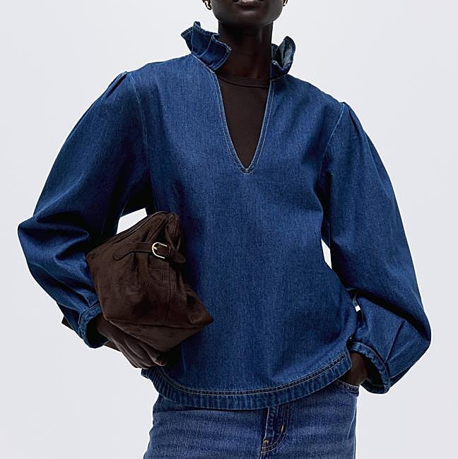 Por otro lado, te proponemos una versión muy similar que nos ha conquistado por su color azul denim oscuro, ese tono versátil que combina con todo, desde jeans claros hasta los más oscuros. También cuenta con mangas abullonadas, corte amplio y escote en pico con detalles de volantes. Es de H&M.