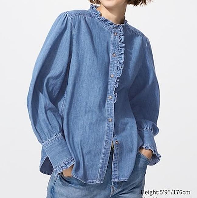 En esa misma línea encontramos este modelo de Uniqlo, confeccionado en 100% algodón ligero. Destaca por su pequeño volante que recorre el cuello redondo y la tapeta de botones, un detalle sutil y romántico que eleva cualquier look.