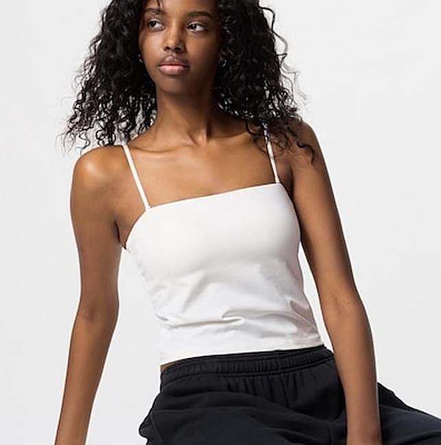 AIRism de Uniqlo tiene varias camisetas con sujetador incorporado. Este es uno de los modelos favoritos, un diseño corto con sujetador y confeccionado en algodón. Lleva tirantes finos que se pueden colocar cruzados en la espalda. Precio: 24,90 euros.