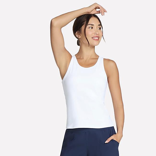 Siéntete cómoda y práctica con esta camiseta de tirantes con sujetador integrado de Skechers. Este tank top de estilo casual incorpora un sujetador con copas Air-Cooled Memory Foam extraíbles y tejido GO FLEX que absorbe la humedad. Precio: 50 euros.