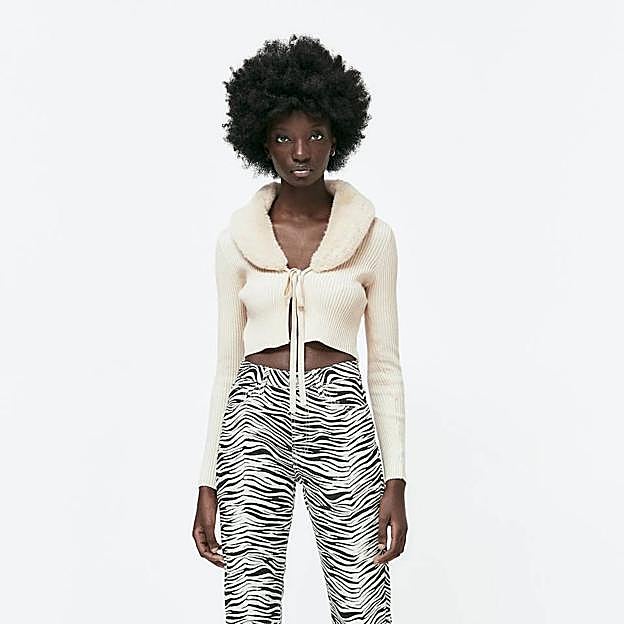 Hablamos de un cárdigan crop en punto canalé con solapa efecto pelo, manga larga y cierre de lazada (una de las tendencias del momento popularizada por firmas de lujo como Jacquemus, que resalta la sensualidad y aporta un toque diferente para llevar sola, con un bralette de punto o combinada con otros tops). Disponible en el mismo tono crudo, a solo 29,95 euros.