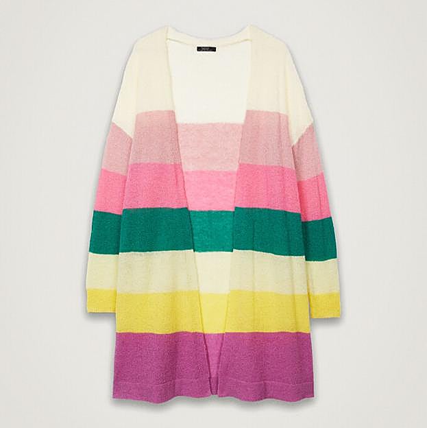 Se trata de un cárdigan de la nueva colección de Parfois y aunque en el catálogo lo han presentado con un estilismo más veraniego con shorts, nosotras ya nos lo hemos imaginado ahora mismo con vaqueros blancos (o si prefieres azules), camisa básica y con botines. Es el típico look de entretiempo que te soluciona el día y que además, gracias a la fuerza del cárdigan, te alegrará la semana.