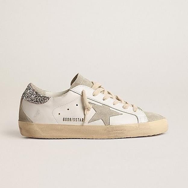 Golden Goose. Estas Super-Star con pala de piel blanca se distinguen por su estrella de ante de color gris hielo y su refuerzo del talón con purpurina plateada. Y como toque final, la aplicación y la lengüeta de ante color gris. Precio: 495 euros.