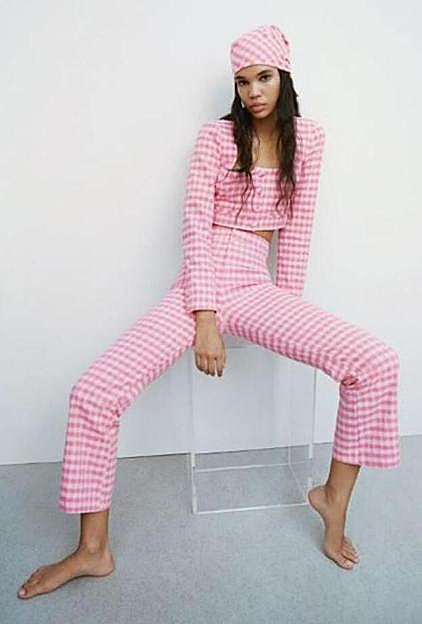 Se trata de un conjunto formado por un pantalón de talle alto y un top de lo más original en color blanco y rosa. La parte superior que cuesta 22,95 euros simula una chaqueta cropped con falsos botones y un original escote. Un dos piezas súper favorecedor que también puedes usar con una blusa o camisa blanca debajo si eres de las que prefiere no enseñar la tripa y que... ¡Está súper rebajado!