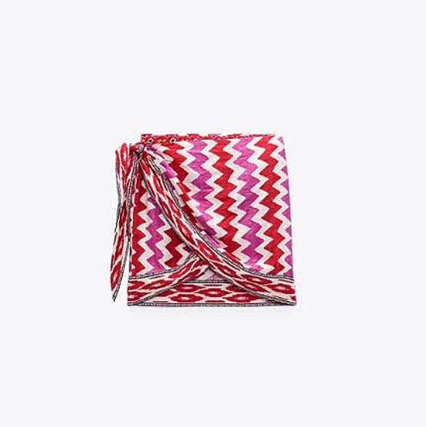Carmen combinó su bikini blanco con una falda tipo pareo y de tiro alto que tiene un diseño cruzado que va anudado en un lateral. Es ideal porque tiene un estampado geométrico en zig-zag que mezcla colores como el rosa y el rojo y algún remate en negro. Cuesta 25,95 euros y aunque estaba disponible desde la talla XS a la XL, ahora misma en la web están todas agotadas. Y es que, como decimos, es una falda con muchísimo éxito y es casi imposible hacerse con ella.