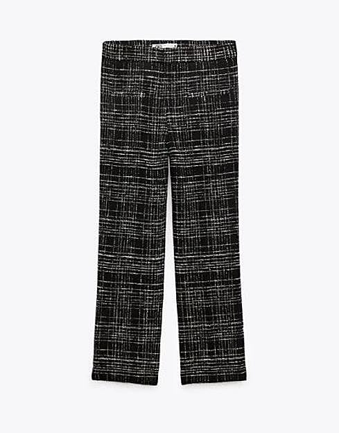 Se trata de unos pantalones de tiro medio confeccionados en un tejido similar al tweed muy calentito, grueso y perfecto para los días más fríos del invierno. Tienen un bonito estampado de cuadros blancos sobre un fondo negro, un 'print' ideal y muy ponible, que al tener una combinación de colores neutros, hace que sea una prenda que pegue con todo y que puedes llevar de un sinfín de maneras. Cuestan 29,95 euros y tienen un diseño de pernera recta muy cómodo y perfecto para el día a día.