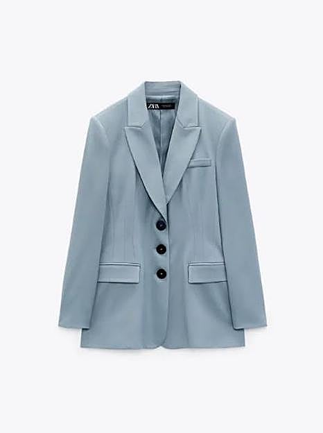Es una americana larga y cruzada también con botones en negro que se diferencia por tener abotonadura simple, en vez de doble, y por ser de un tejido mucho más fino. Cuesta 59,95 euros, está disponible desde la talla XS a la XL- aunque esta última ya está agotada en la web de la firma- y por tener sus pantalones de pinzas a juego. Ahora ya puedes unirte también a la tendencia del traje azul favorita de las famosas.
