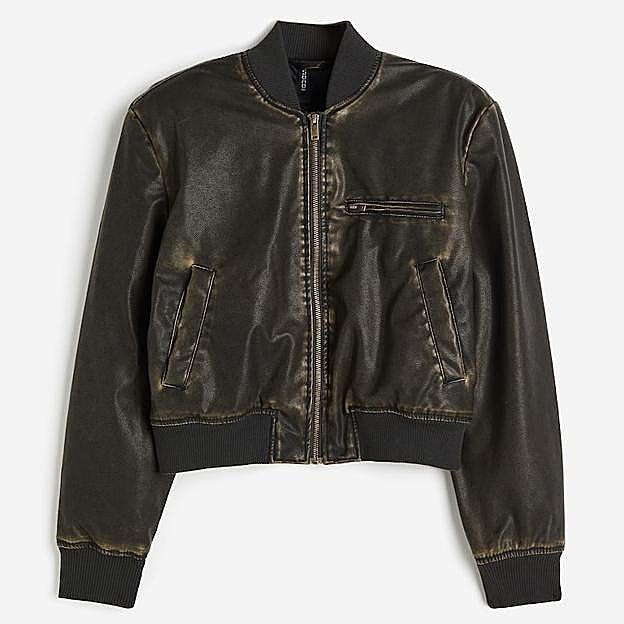 En H&M pudes ficha esta cazadora bomber corta en tejido revestido con acabado desgastado. Es un modelo de corte holgado con cuello corto de canalé, cierre de cremallera y hombreras. Precio: 59,99 euros.