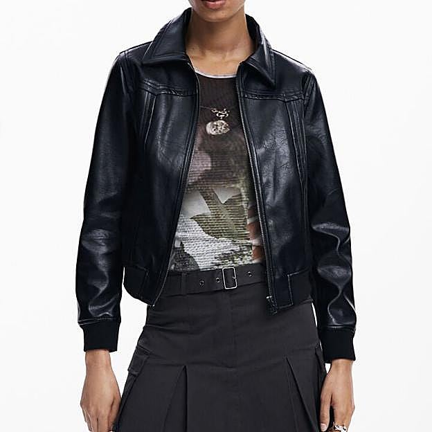 Si prefieres algo más básico, ficha esta chaqueta biker efecto piel con cuello de camisa y cierre de cremallera de Desigual. Es un modelo confeccionado en poliéster reciclado, con manga larga y cierre de cremallera visible. Precio: 119 euros.