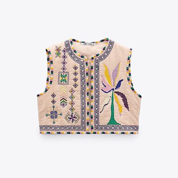 Se trata de un chaleco corto con cuello redondo y manga sisa. Es uno de los chalecos de la nueva colección de primavera-verano de Zara. Una prenda que llama la atención al instante por su diseño. Cuenta con una serie de bordados étnicos en diferentes tonalidades. Encontramos tonos como el lavanda, el verde, el azul, y el rosa. Este último color es que el que predomina en todo el chaleco.