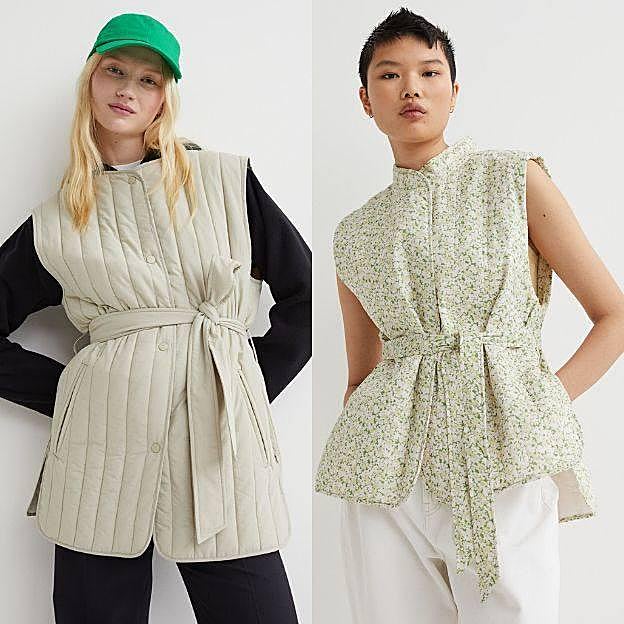 En H&M encontramos dos versiones más ligeras y primaverales del chaleco acolchado. El primero, un chaleco con guateado a rayas verticales, manga sisa amplia, cierre de botones a presión y bolsillos laterales al bies, con cinturón de lazada extraíble, a juego en el mismo tejido, color beige claro, con un precio de 39,99 euros. Y, la otra opción es un chaleco padded de algodón con estampado floral en tonos verdes. Tiene cuello subido, cierre de botones ocultos, bajo asimétrico y cinturón para anudar y, su precio es el mismo que el anterior, 39,99 euros.